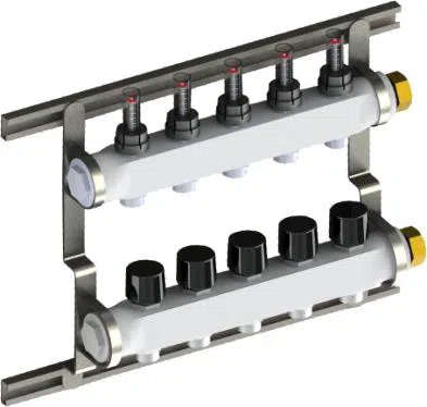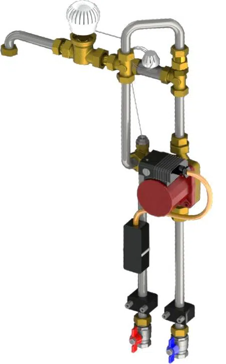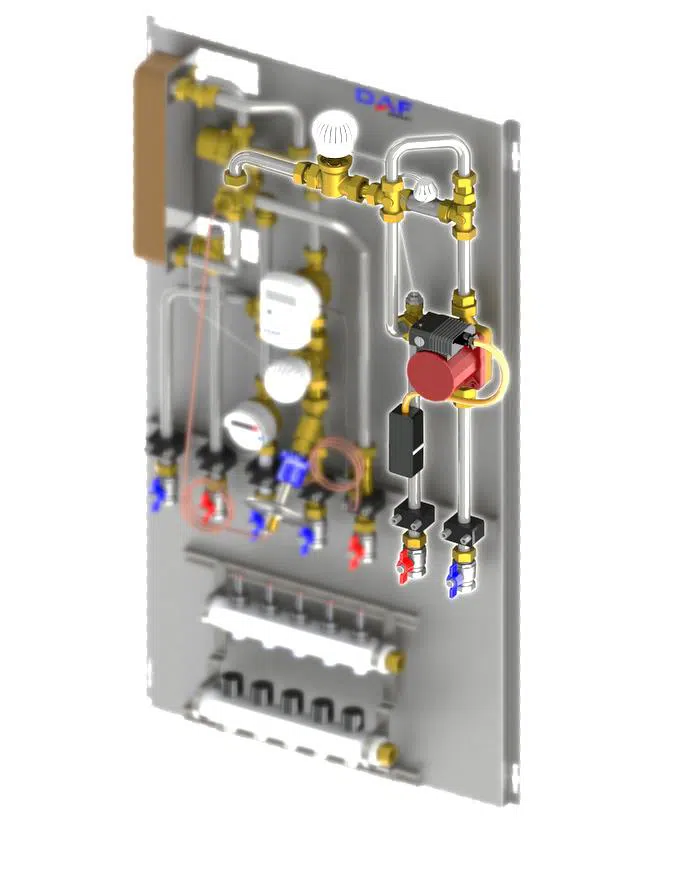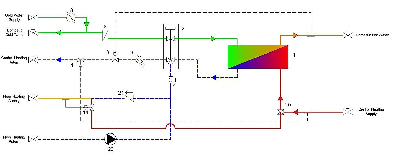 1.Plakalı Eşanjör,3.Termostatiksıcaklık kontrolü4.Zonventili5. Fark basınç kontrol cihazı, 6. Kullanım suyu limitleme vanası7. 5 yollu dağıtıcı8. Su sayacı9. Isı sayacı 14. Termostatikvana15. Fark basınç kontrol cihazı20. Yerden ısıtma sirkülasyon pompası13. Kontrol vanası
